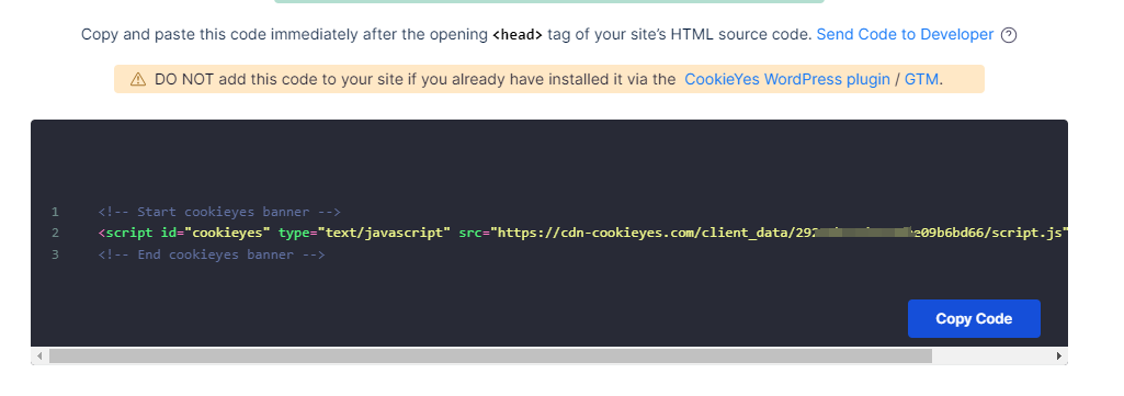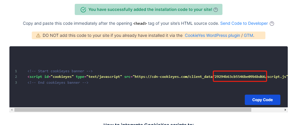 返回到CookieYes 后台,在仪表盘里,找到CookieYes的代码,在代码中有一行数字就是网站的密钥,如下图: