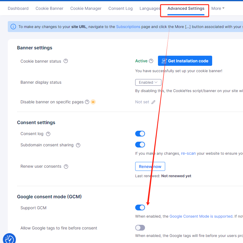 添加完网站的consent mode banner之后,我们还需要在GTM上进行代码的追踪配置。不知道如何网站如何安装GTM的可以戳如何安装GTM?安装之前我们还是需要到Cookie Yes的后台打开Google consent mode 。
