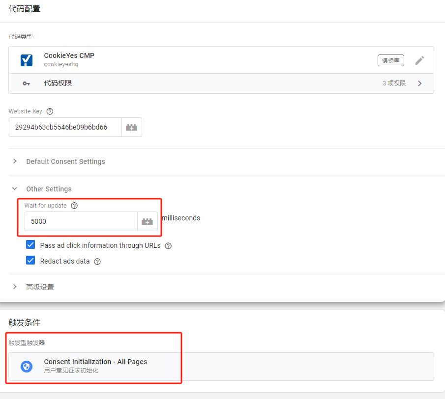 输入完成网站的密钥之后,下面我们需要进行一些设置,在Other settings里面,有一个Wait for update,也就是用户在进入网站的时候cookie的显示时间,这里我们设置成5000,因为这里的单位是毫秒,所以如果设置太短的话,用户会看不到。