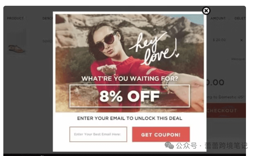 i.关闭按钮太明显了。(这一点真的是绝了,可以把叉叉关闭按钮设置模糊,客户不太容易找到关闭按钮,自然就点订阅邮箱)