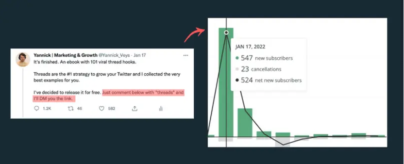 Yannick 没有使用典型的流量吸引方法,而是在Twitter上提供了一本新电子书《101 Viral Thread Hooks》。