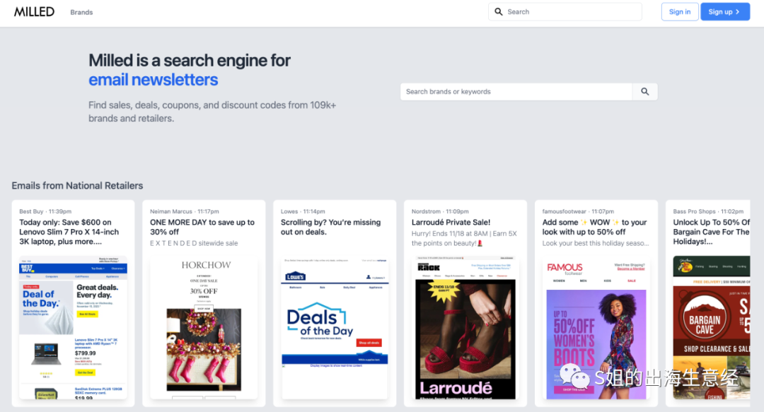 Milled.com 更偏重于Spy功能,可以通过品牌或者关键词搜索到具体的某个公司的所有EDM邮件。通过分析竟对的邮件,可以洞察到 1 -竟对邮件策略 2 -测算竟对价格折扣策略 3 -好的文案/设计的启发