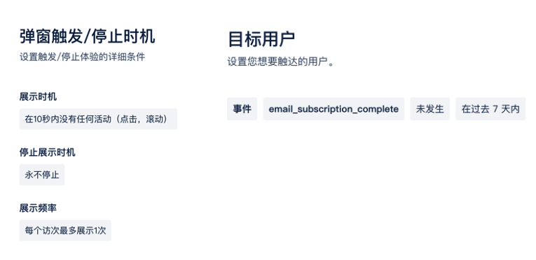 你可以利用触发规则来设定显示弹窗的频率,使每次访问只展示一次促销活动,并在连续展示之间留出间隔,例如每7-10天只触发一次。具体设置取决于你的目标受众、产品品类以及购物者处于的考虑阶段。