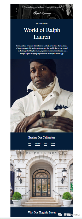 这一点大家可以多去订阅大牌,竞争对手的邮件,感知一下Design的重要性。比如美国品牌Ralph Lauren的第一封订阅邮件