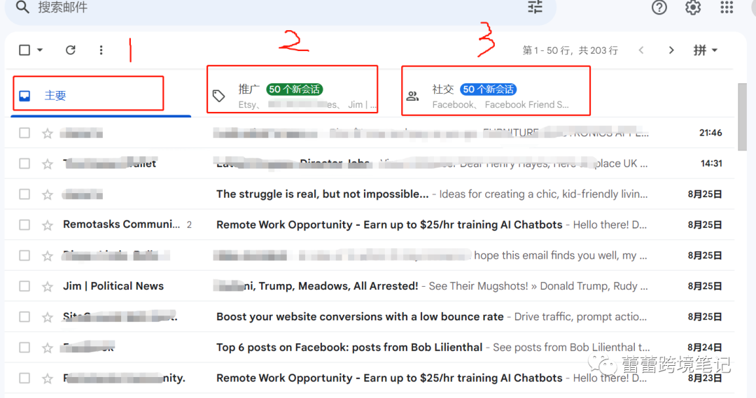 下图是我的一个gmail邮箱,大家可以看到在1这个位置有一个主要邮件,这里就是邮箱的邮件主列表,我们一般就只看这个部分的邮件。像2,3这两个系列的一般都是营销邮件,广告,社媒提醒之类的,一般我都会忽略。