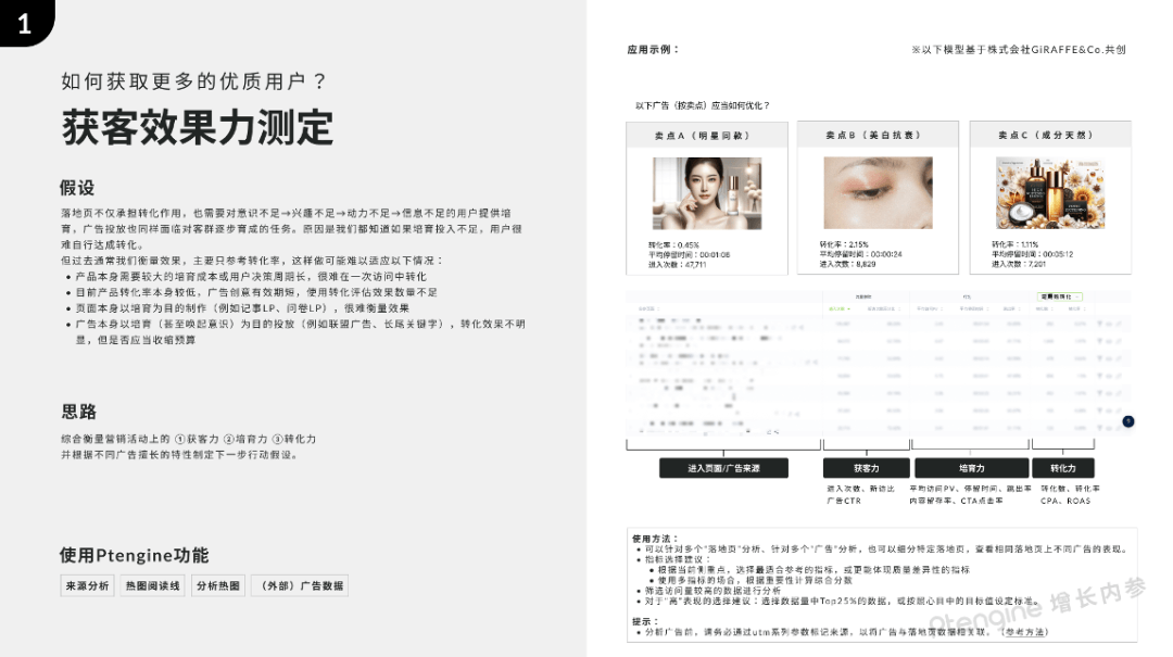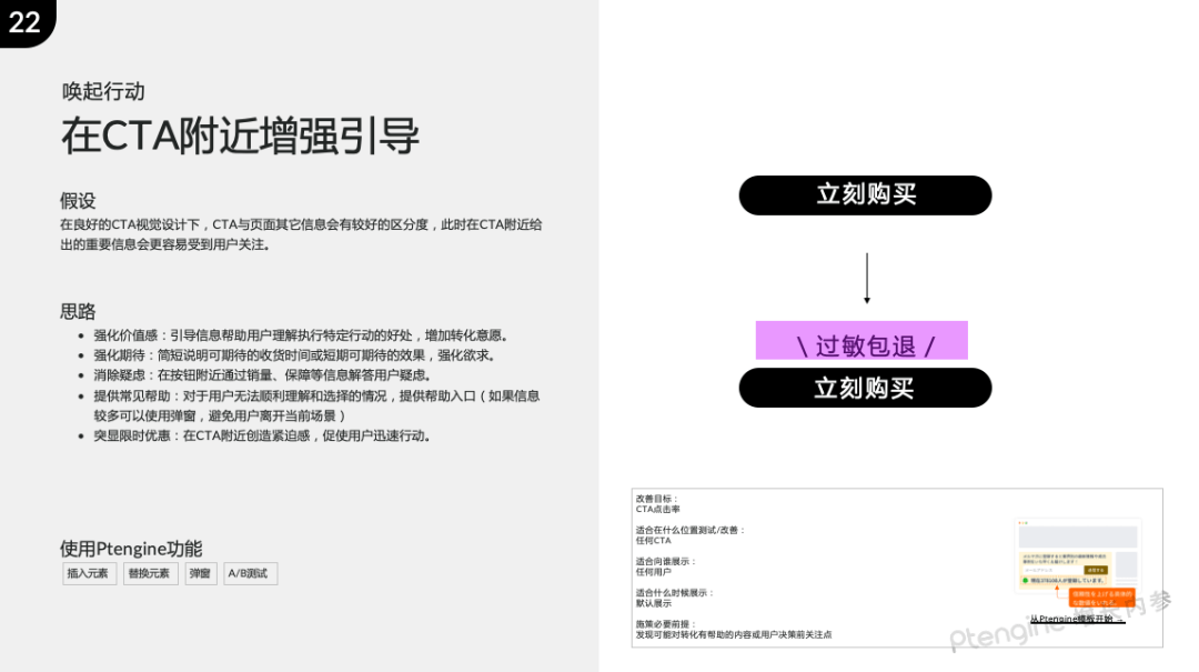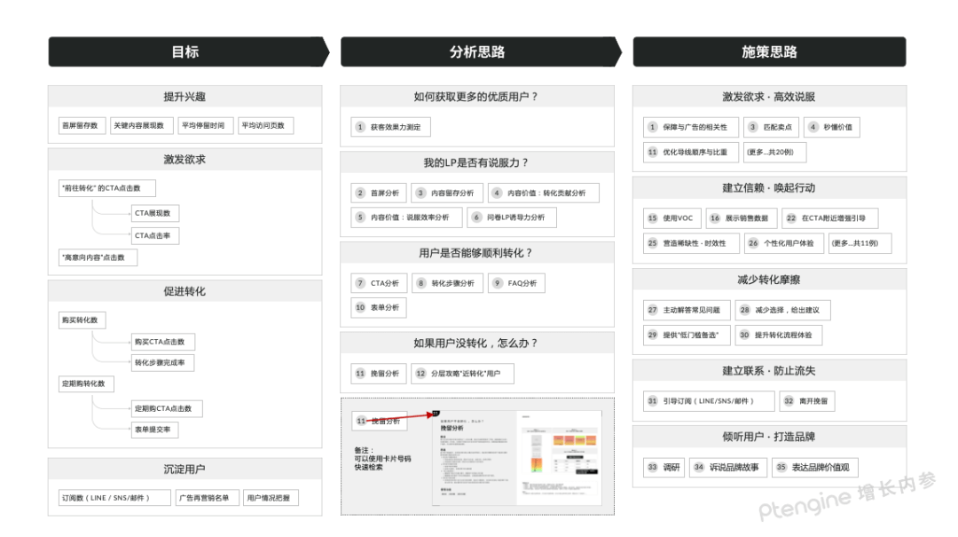 因此,我们决定尝试不再追逐新“点子”,而是总结了一些思维模板,并与一些大师共创了分析模型。这份资料中不再围绕“位置”介绍,例如“测试首屏”、“修改CTA”、“添加包邮信息”这样具体的例子,而是更多尝试找到用户需要的“信息”,这个信息可能适合添加在首屏、CTA附近、也可能适合在挽留弹窗上、甚至在广告创意中;希望这些思维模板能为你激发出更多有假设的灵感。