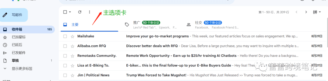 3.so you want to send most of your emails to the engaged people who open your emails and clicks your emails so the email providers Gmail Yahoo Hotmail they can see that your recipients they actively engage with your emails and you don’t send just Spam to them and once you have it。提升你的邮件进入主选项卡的几率,让更多的人跟你的邮件互动,点击邮箱内容。更少的人投诉你发垃圾邮件。这会让邮件公司认可你的邮件,觉得你这个邮件ID是一个优质的ID,他们会自动的提升你的邮件在主选项卡的几率。