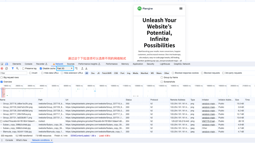在Chrome浏览器中,我们可以使用网络节流工具来模拟某些互联网连接,如3G或4G连接。这对于在特定情况下评估网页加载时间非常有价值。