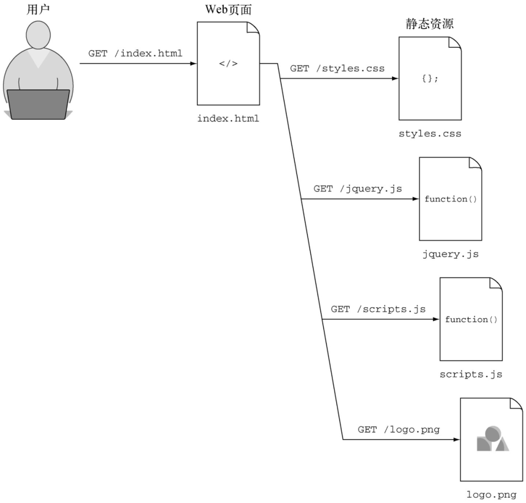 当浏览器遇到这些文件引用时,会发出新的HTTP请求来获取它们。最初的网页请求会转变为多个请求,其中包括样式表文件和JavaScript文件的请求,还有图片文件的请求。虽然5个请求看起来可能不算多,但典型网站的请求数量通常会是其10倍甚至更多,特别是复杂的网站可能拥有上百个请求。