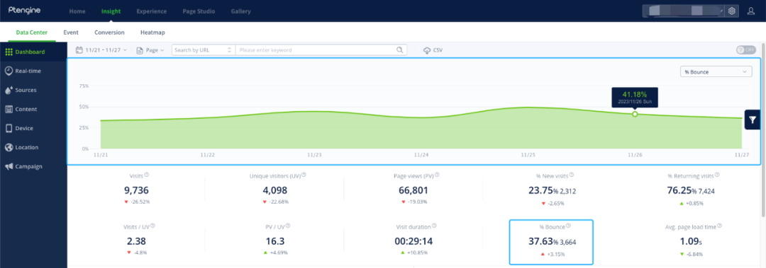 根据Ptengine全球20万客户网站数据统计, 大多数网站的跳出率在25%至70%之间。