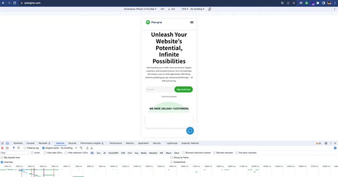 这些工具可以模拟网页在移动设备上的外观,以及在实际物理设备上的外观。其中一个常用的工具是浏览器的设备模拟模式,如Chrome浏览器的开发者工具中的设备模拟功能。通过选择不同的设备类型,可以模拟页面在不同屏幕尺寸和设备上的外观。这有助于检查网站在不同设备上的响应式布局和样式表的表现,并进行必要的修复和优化。(下图是在Chrome中使用设备模拟模式查看Ptengine.com)