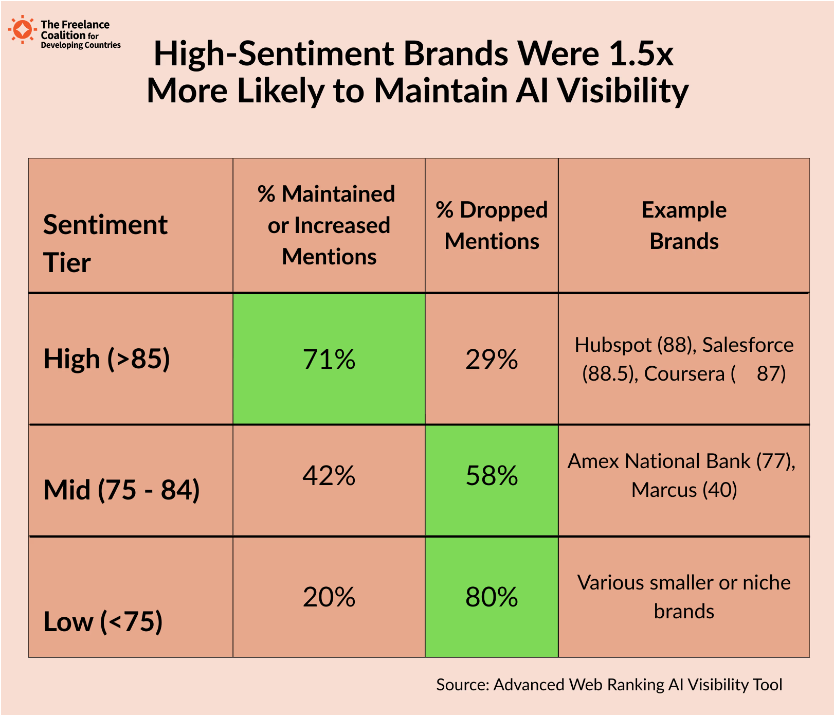 相比之下,中 sentiment 范围内的品牌(75-82)表现出更大的波动性,经常波动或完全消失。这些品牌不一定权威性较低,但数据显示中立或混合 sentiment 可能使它们在 LLM 生成的 content 中更容易被替换。