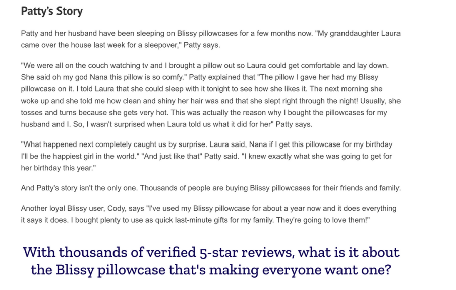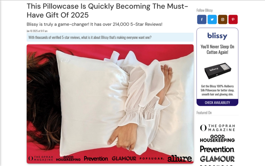 Blissy《这枕头是2025年的必送礼物》,页面没有“直接卖枕套”,而是通过讲述Patty的故事体验切入: