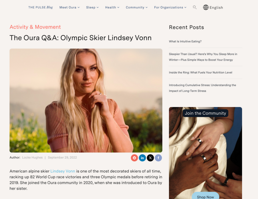 Oura 将代言人变成落地页核心内容,通过“健康生活方式领导者”的形象来强化信任感: