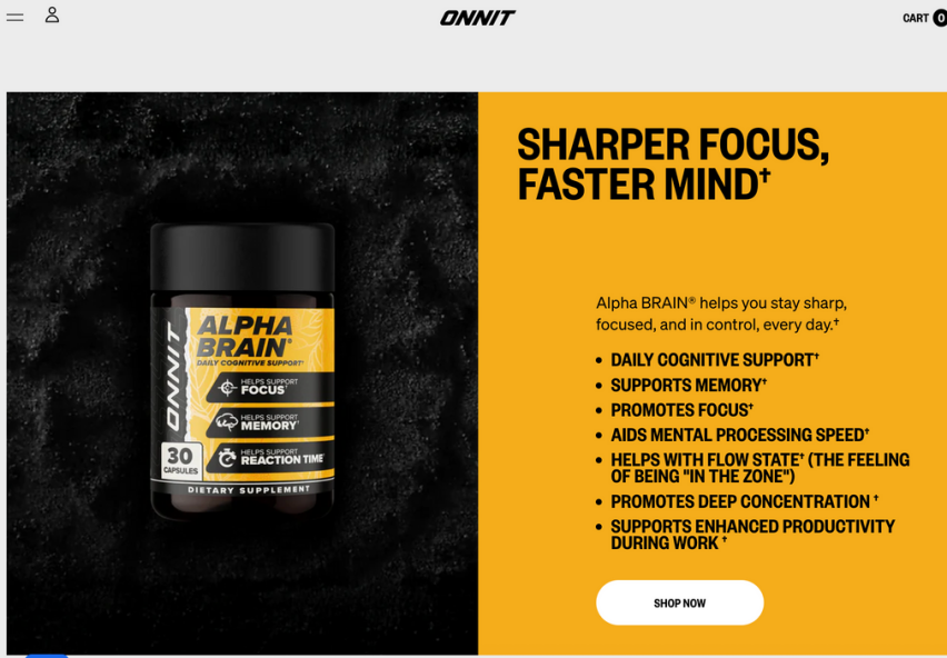 Onnit 选择将 Alpha Brain 作为唯一视觉焦点,页面结构非常适合 DTC 品牌参考: