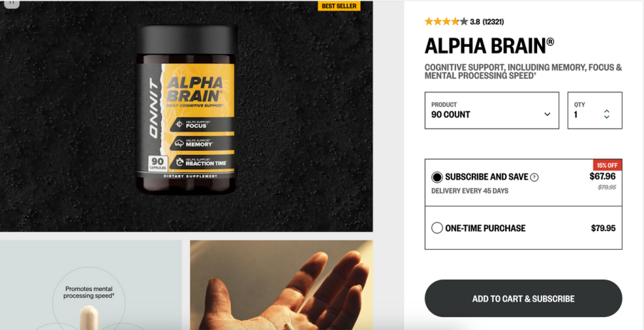 Onnit 的 Alpha Brain 产品页,是价格模型测试页的典型应用,通过订阅 vs. 一次性购买的对比,让用户倾向选择更高 LTV 的订阅方案。Onnit 的结构特点非常值得参考: