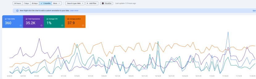 我跟客户沟通后,建议他们尝试更换一个新域名。客户也比较配合,很快完成了域名切换。结果,就在更换新域名之后不到一周,GSC 里就开始出现收录记录了,页面陆续被索引,也开始陆续有展示量和点击进来。