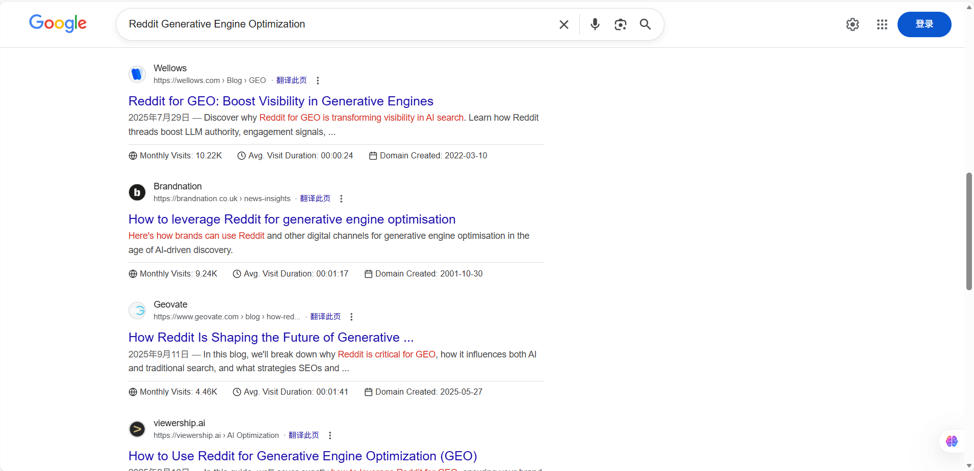 我们先搜索一下Google关于Reddit和GEO的关系,可以得到如下的结果: