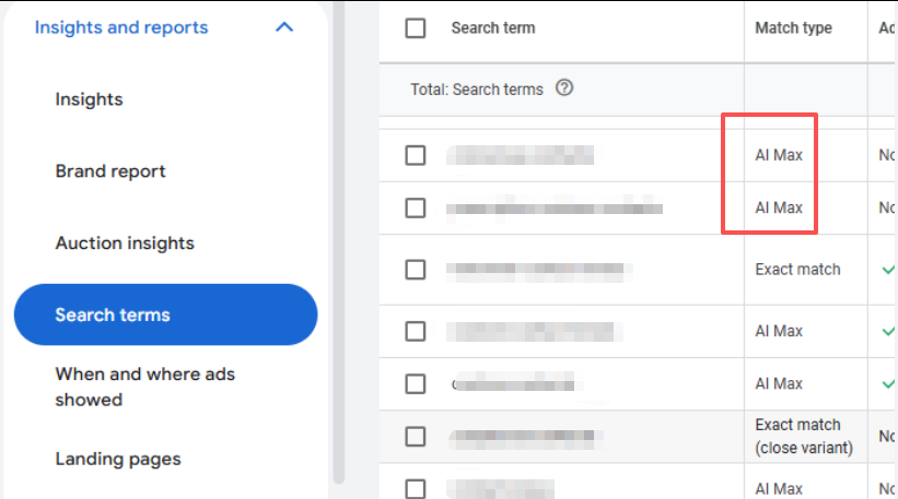搜索字词报表就会提示哪些词是由AI Max触发的,你也可以看到匹配程度跟自己设置的关键词差距是多少。不相关的可以自行排除(比较麻烦)