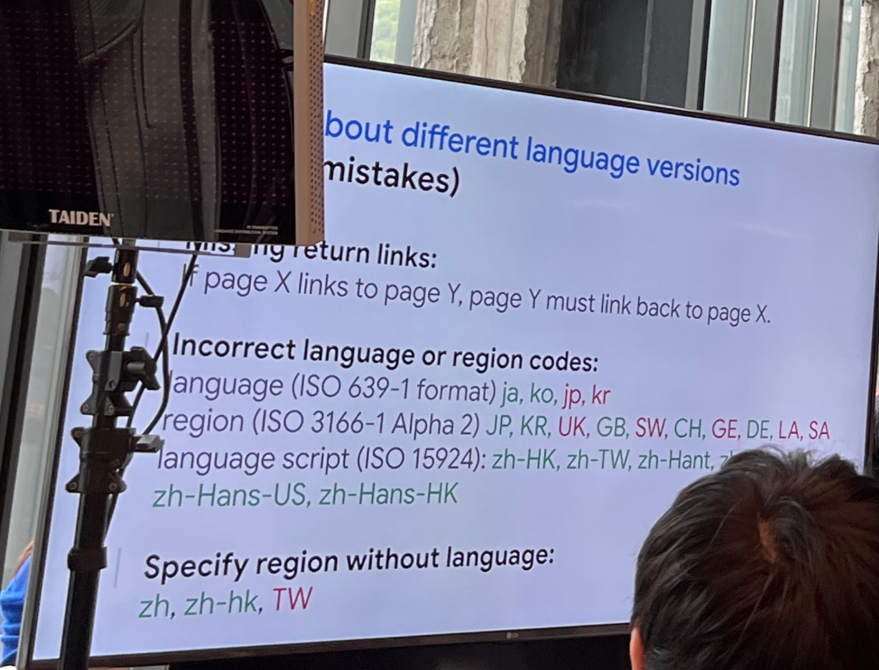 • 多语言最好用 hreflang 标签来表明网页不同的语言版本,如 <link rel="alternate" hreflang="lang_code" href="url_of_page" rel="external nofollow" />,不过这个 lang_code 一定要使用支持的语言和区域代码;当时在现场朋友就发现他们的日语网页有这个问题,日语网页的 lang_code 使用的是 jp,而支持的代码是 ja .