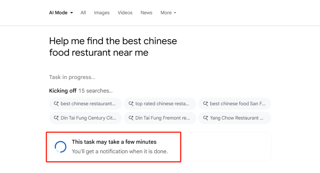 AI Mode会检索大量关键词及其结果,任务执行大概需要几分钟的时间: