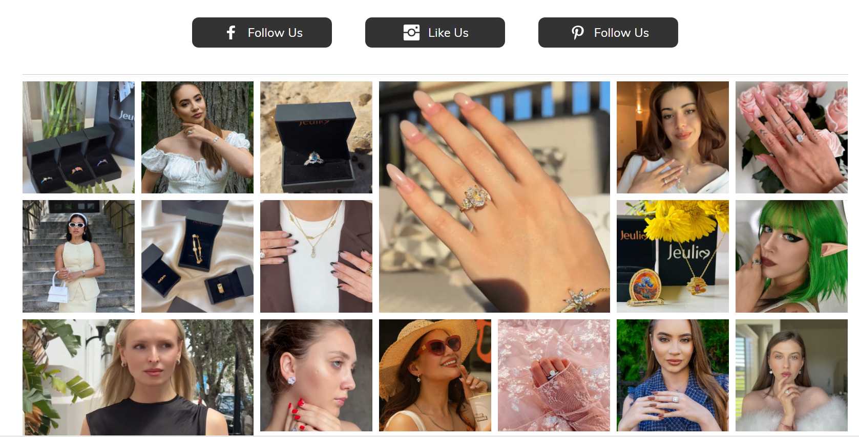 品牌打造 “视觉平台引流 + 社交平台促活” 的流量体系:Pinterest 设立 54 个细分画板,按颜色、风格、节日分类聚合产品,节日专属画板仅添加促销字样即实现高效引流,平台粉丝超 10 万,单个用户平均浏览时长达 17 分钟;Instagram 以专业级美图传递品牌调性,搭配 “让每一天都充满惊喜” 等正向文案,近 19 万粉丝中 30% 完成官网跳转;Facebook 承担转化核心职能,通过动态广告 + 再营销实现 ROI 3.8,开发的 “珠宝顾问” 聊天机器人解决 70% 常见咨询,累计获赞超 190 万;TikTok 发起 #JeuliaChallenge 话题,用户生成内容超 12 万条,最高单条视频带货 37 万美元。多平台各司其职又相互联动,形成流量闭环。