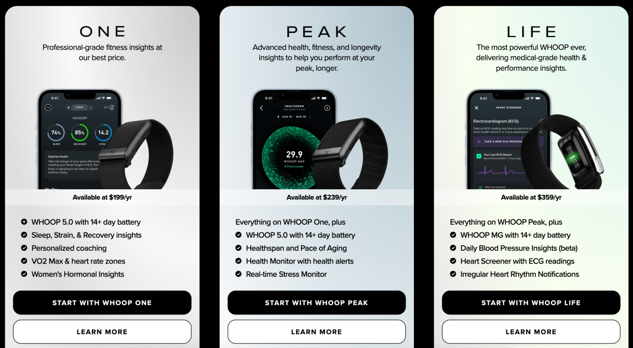 相比于传统的“产品+会员”的订阅制,WHOOP激进地将产品本身设置成了免费,但用户在购买时必须搭配不同的订阅套餐进行购买,并且后续还要按年进行付费。