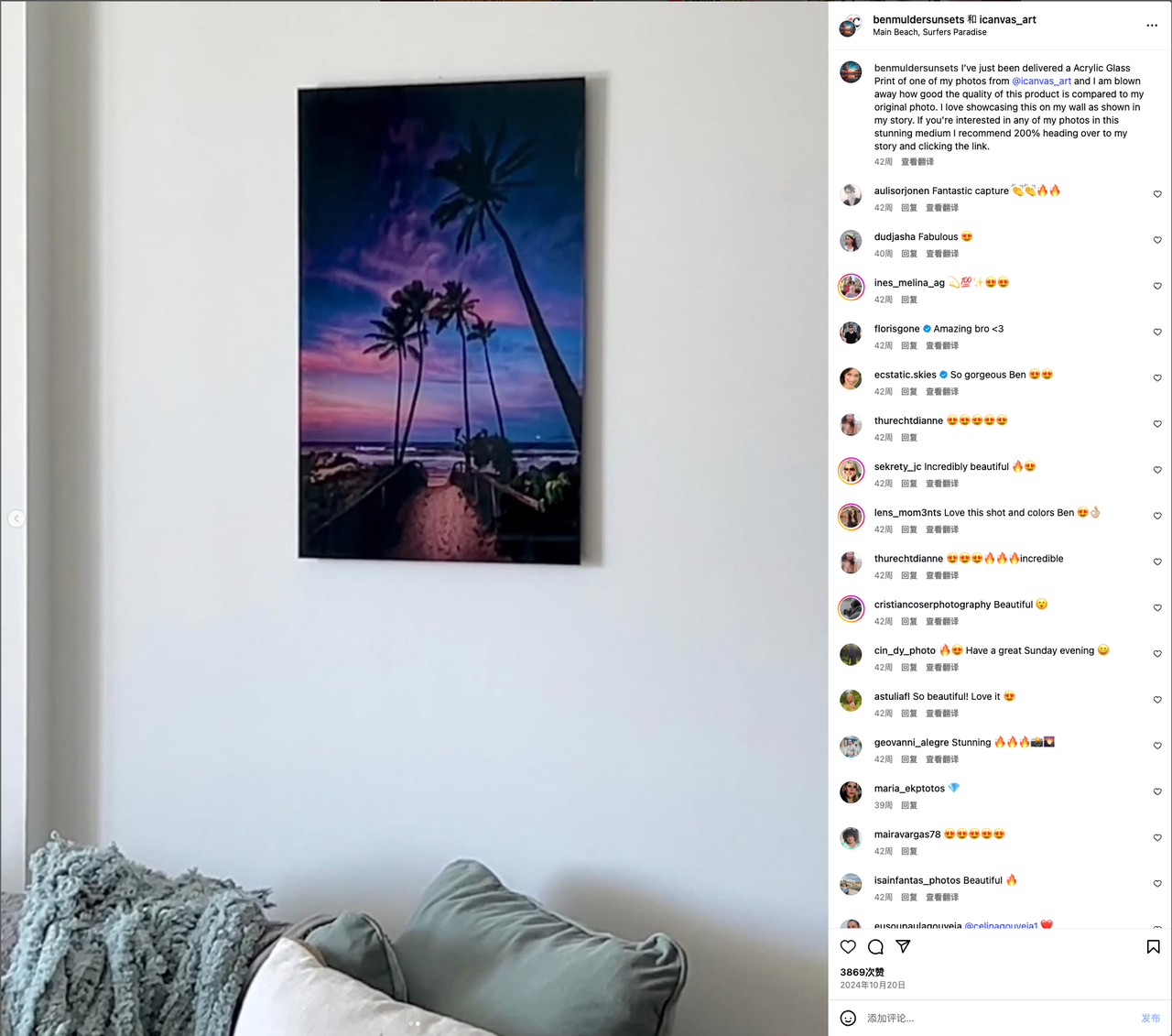 最后,当消费者分享他们将这些独立艺术家作品挂在家里,并配上相应艺术家信息与iCanvas标签时,这种真实视觉+推荐形式的内容比任何付费广告更能激发信任,能帮助品牌在海外市场低成本获得真实曝光与口碑传播。