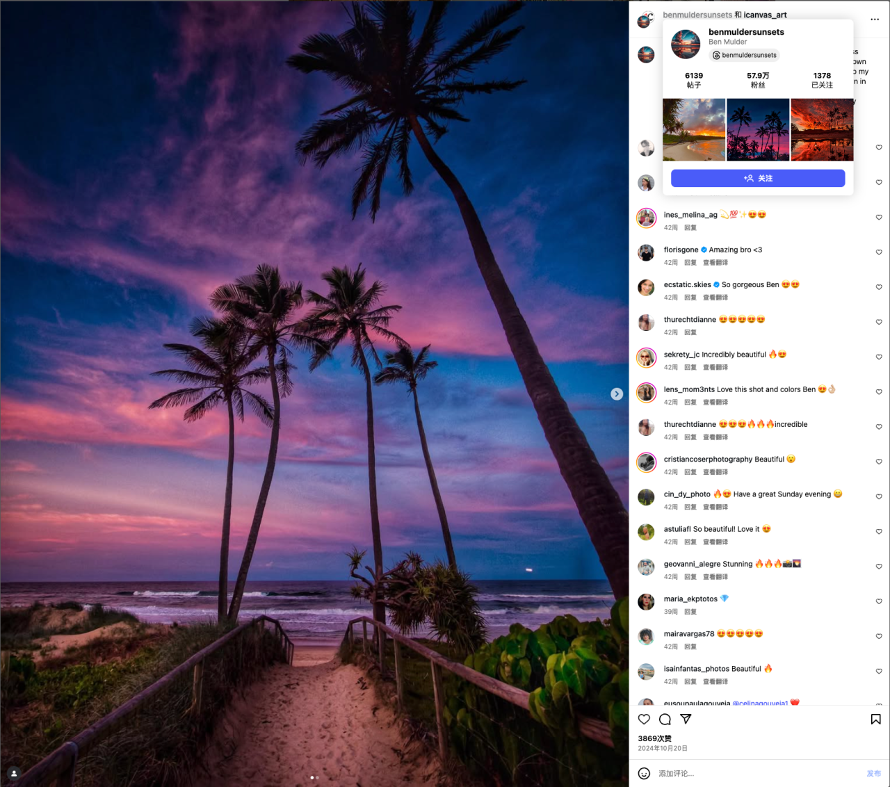Ben Mulder,一位专注于晚霞、日落的摄影师。其作品多以广角拍摄,因此视觉效果震撼、色彩极其艳丽,因此其Instagram账号拥有57.9万的粉丝关注。