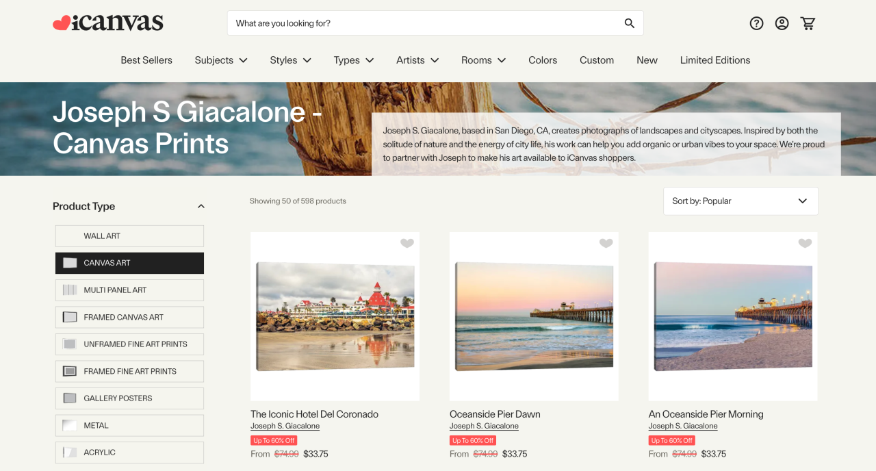 iCanvas 在官网和博客中介绍了多位合作艺术家,比如 Fernando Méndez(名人漫画肖像)、Joseph S. Giacalone(自然风光摄影作品)和 Kathrin Federer(黑白摄影装饰画)等。