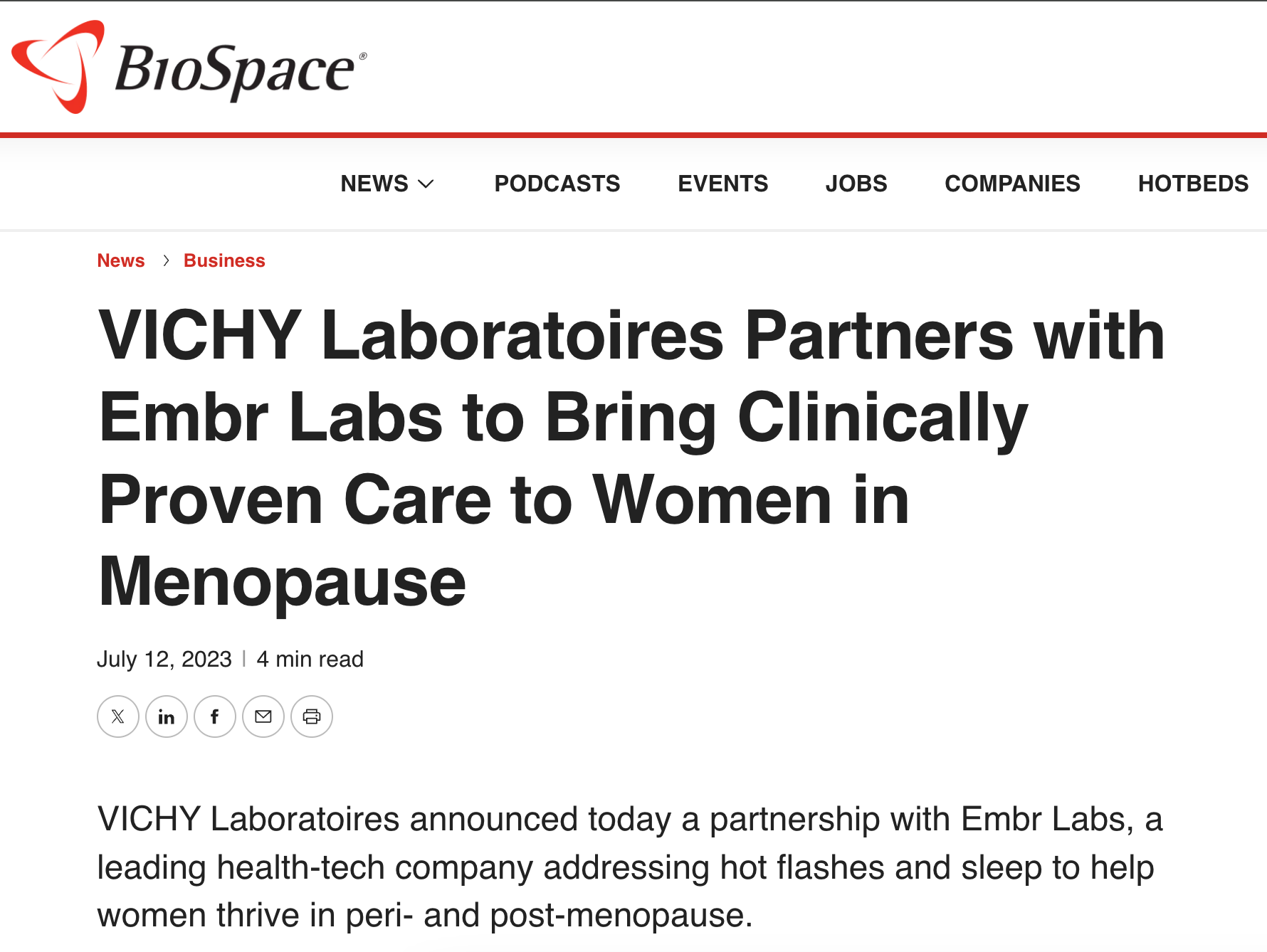 2023 年,品牌与法国护肤品牌 Vichy 达成合作,为其围绕女性更年期推出的 Neovadiol 系列提供定向用户样品,并联合拍摄“更年期视频日记系列”。Embr Wave 内嵌 Vichy 视频,并向购买 Embr 的客户提供护肤样品,反之亦然,形成双品牌互推生态。