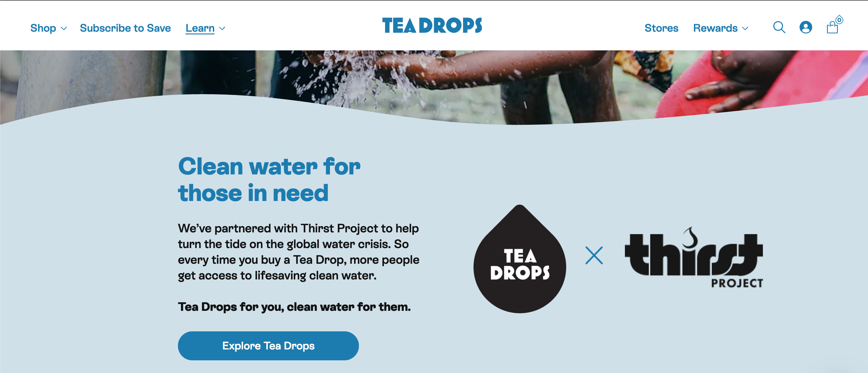 具体而言,Tea Drops在官网中提到:“With every purchase you make (no matter how big or small), Tea Drops will donate a year’s supply of clean water to someone in need”。