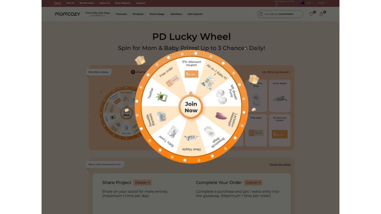 (2)丰富的营销玩法:独立站的营销手段更加灵活,momcozy充分利用了这一点。他们不仅会配合亚马逊Prime Day等大促提前预热,例如在7月8号-14号的Prime Day前,6月27号就开始进行预促。还会推出“幸运大转盘”、推荐返利等多样化的促销手段,例如“买三件减25%”的组合促销方式。