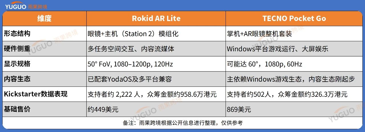 从对比可见,在用户关注度、资金支持及生态构建等方面,Rokid AR Lite 相较 Pocket Go 略占先机;而传音 Pocket Go 则更强调主机性能与游戏体验,定位于 Windows 游戏爱好者与高性能便携娱乐场景。此外,两者所面对的用户群有所不同:前者注重多平台兼容与空间交互通用性,后者则偏向于游戏驱动与硬件沉浸体验。