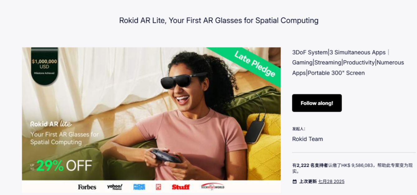 眼镜部分重约 75 g,用户反馈整体佩戴舒适;配合 Station 2 提供空间交互操作与内容输入,定位于消费级大众市场中的“轻 AR + 多任务协作”终端。在Kickstarter吸引约 2,222 位支持者,筹集约 958.6万港元,达成预设目标的多倍。