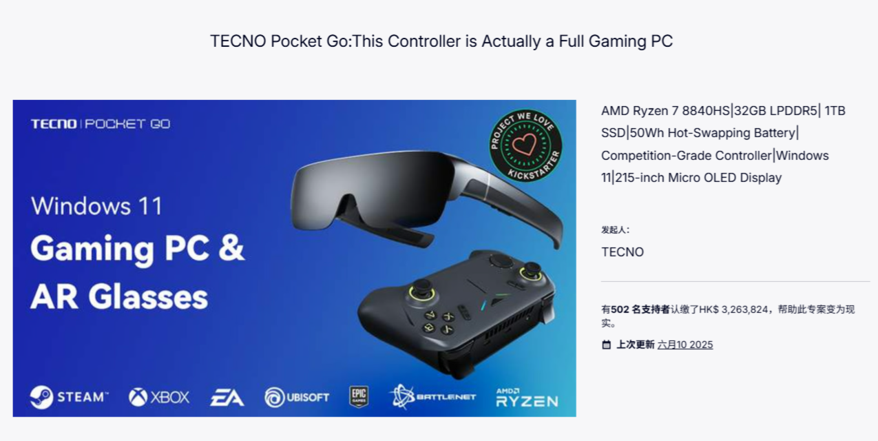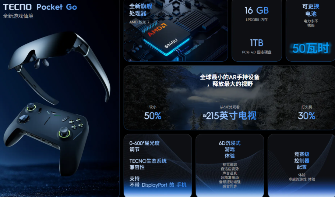 2024年10月,传音通过众筹平台Kickstarter正式上线其AR娱乐套装产品——TECNO Pocket Go,由一款Windows掌机 Pocket Go和一副AR眼镜Pocket Vision组成。该组合被官方称为“全球首款基于Windows系统的AR游戏解决方案”,意图以游戏场景为切入点,探索AR终端的消费级应用落地。