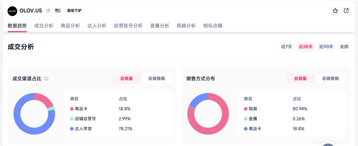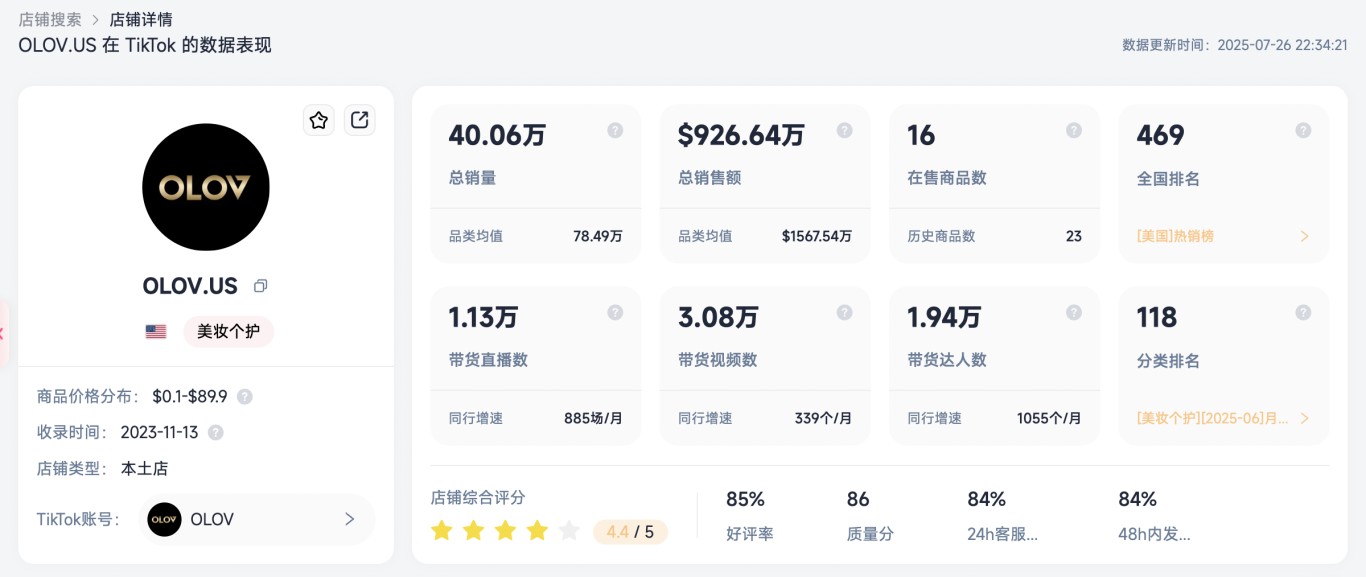 根据FastMoss数据分析平台(www.fastmoss.com)显示,OLOV在TikTok美国的店铺总销售额已超过 926万美金。