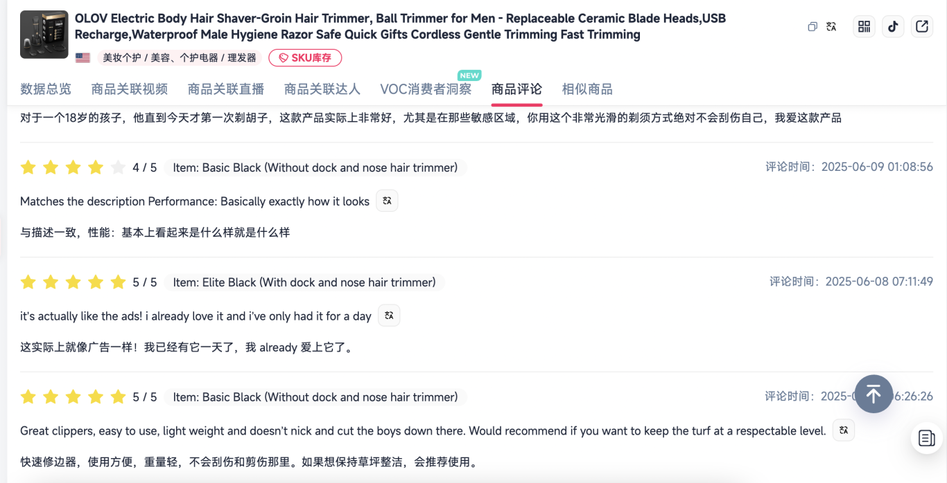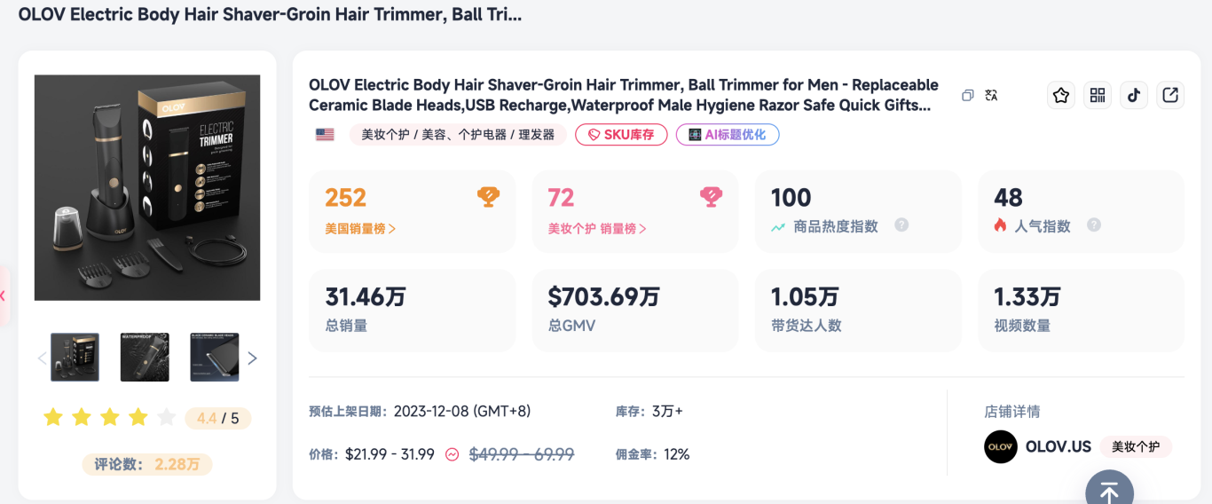 其中Electric Body Hair Shaver单款产品就卖出703万美金GMV,吸引超1万达人自发带货。