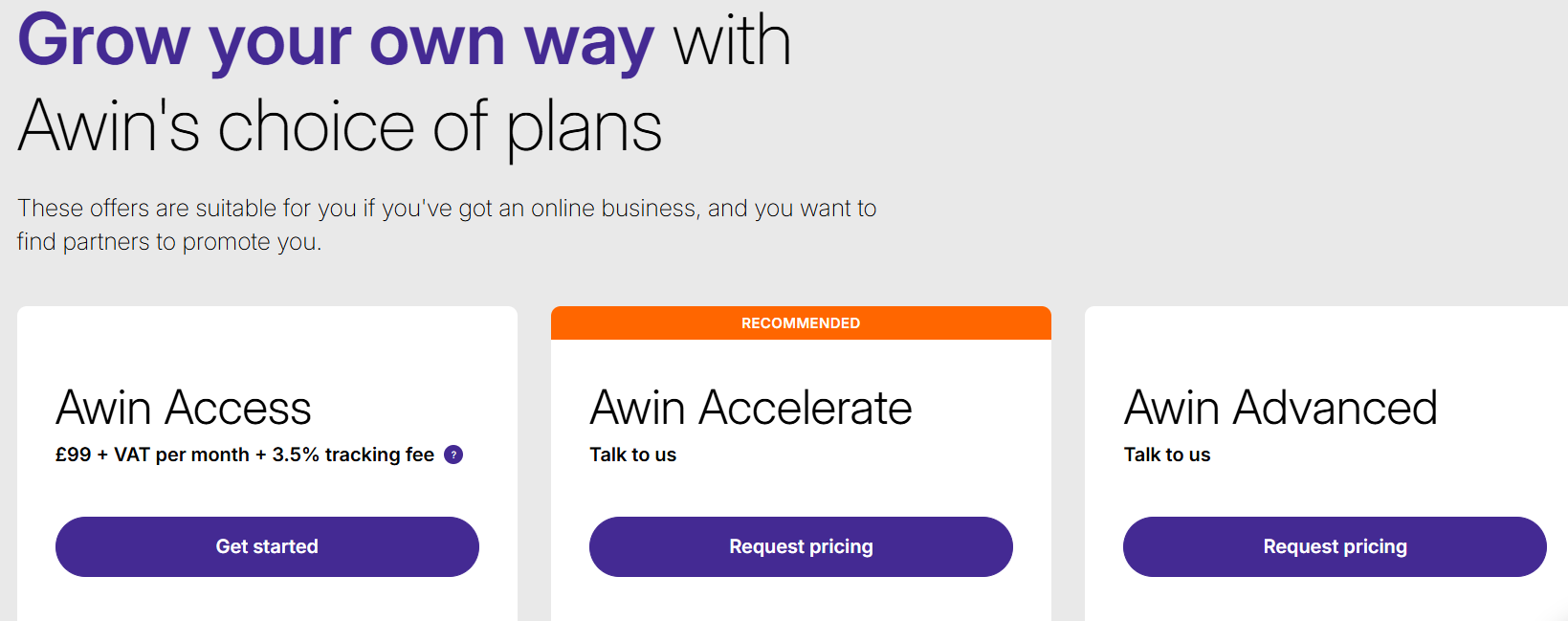 官方报价展示适用于中小卖家的套餐Awin Access:£99 + VAT per month + 3.5% tracking fee,更多详情需要咨询官方进行定制报价。