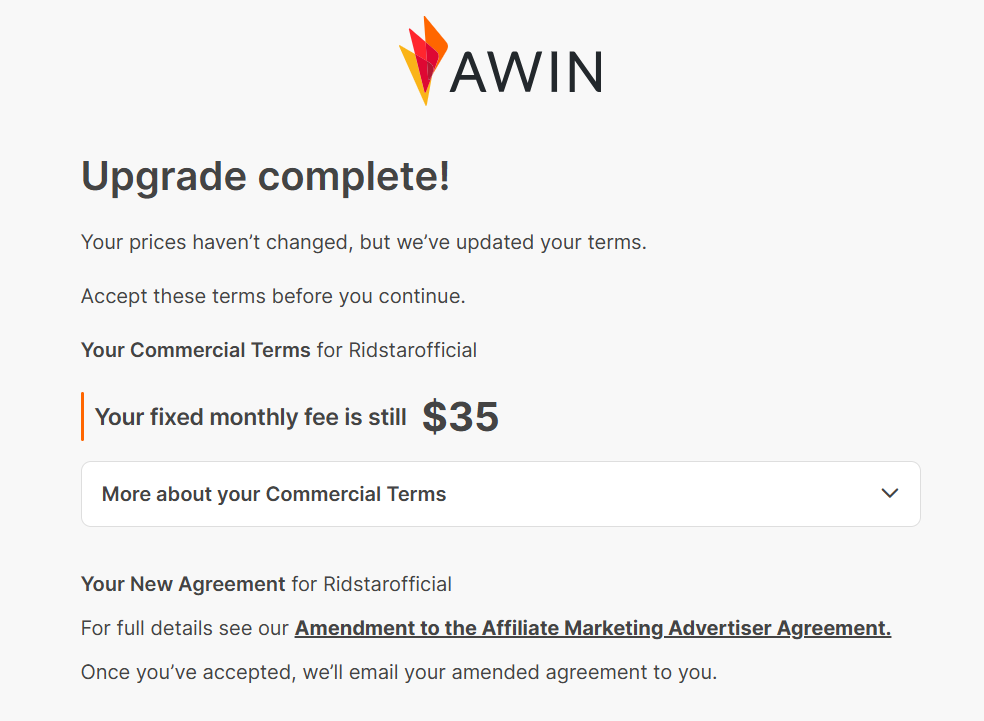 迁移前联盟平台ShareASale的月固定费用已经是35美金,2025年Awin集团对从联盟平台ShareASale迁移过来的商家,联盟平台Awin的月固定费用依然是35美金,远低于直接入驻联盟平台Awin的最低月费标准99英镑了,已经相当厚道了,看得出来Awin集团是想把迁移的损失尽量降低的。