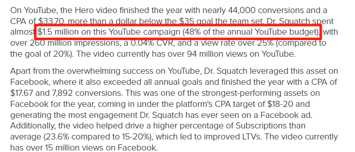 - 实际战绩: 获客超30万!订阅用户飙到7.5万!广告转化4.4万次,CPA仅$33.7!观看量超1.2亿次! 花费近150万美金(占YouTube年预算48%),展示超2.6亿次,CVR 0.04%,观看率>25%!(facebook的战绩也不俗,cpa$17, 近8k转化)还拿了Shorty Awards(表彰社媒创意影响力)!最牛的是:它成功教育了最难搞的美国中部直男为“天然”和“品牌价值”买单!