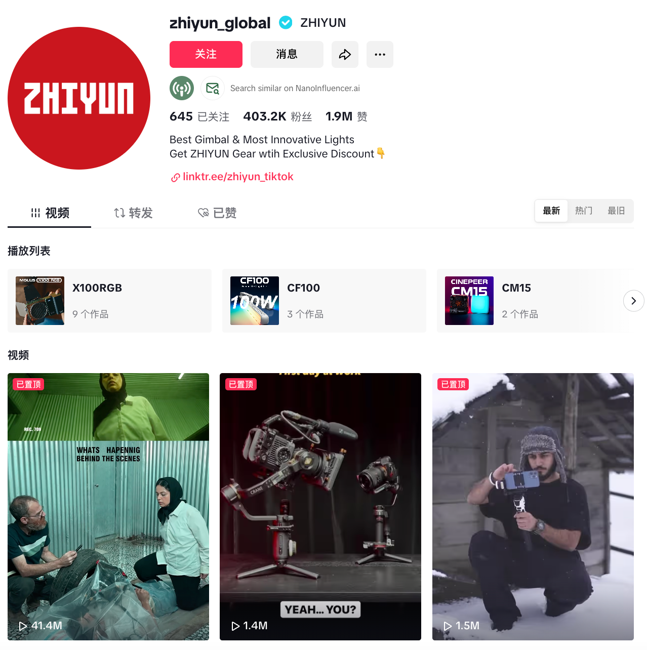 在TikTok平台,官方账号@zhiyun_global通过场景化内容营销积累超40万粉丝,拥有403.2K点赞数据,其内容策略具有三个鲜明特点: