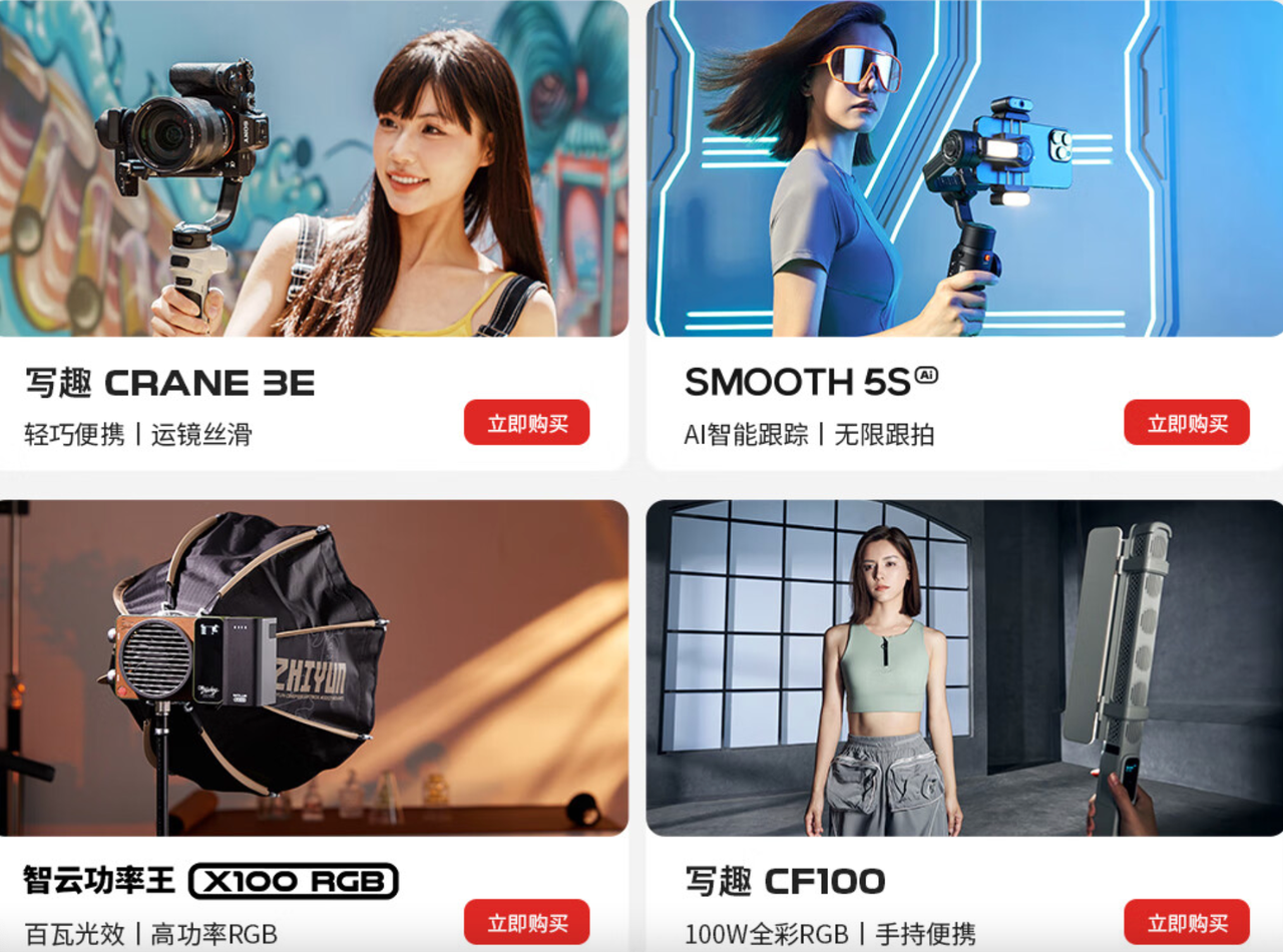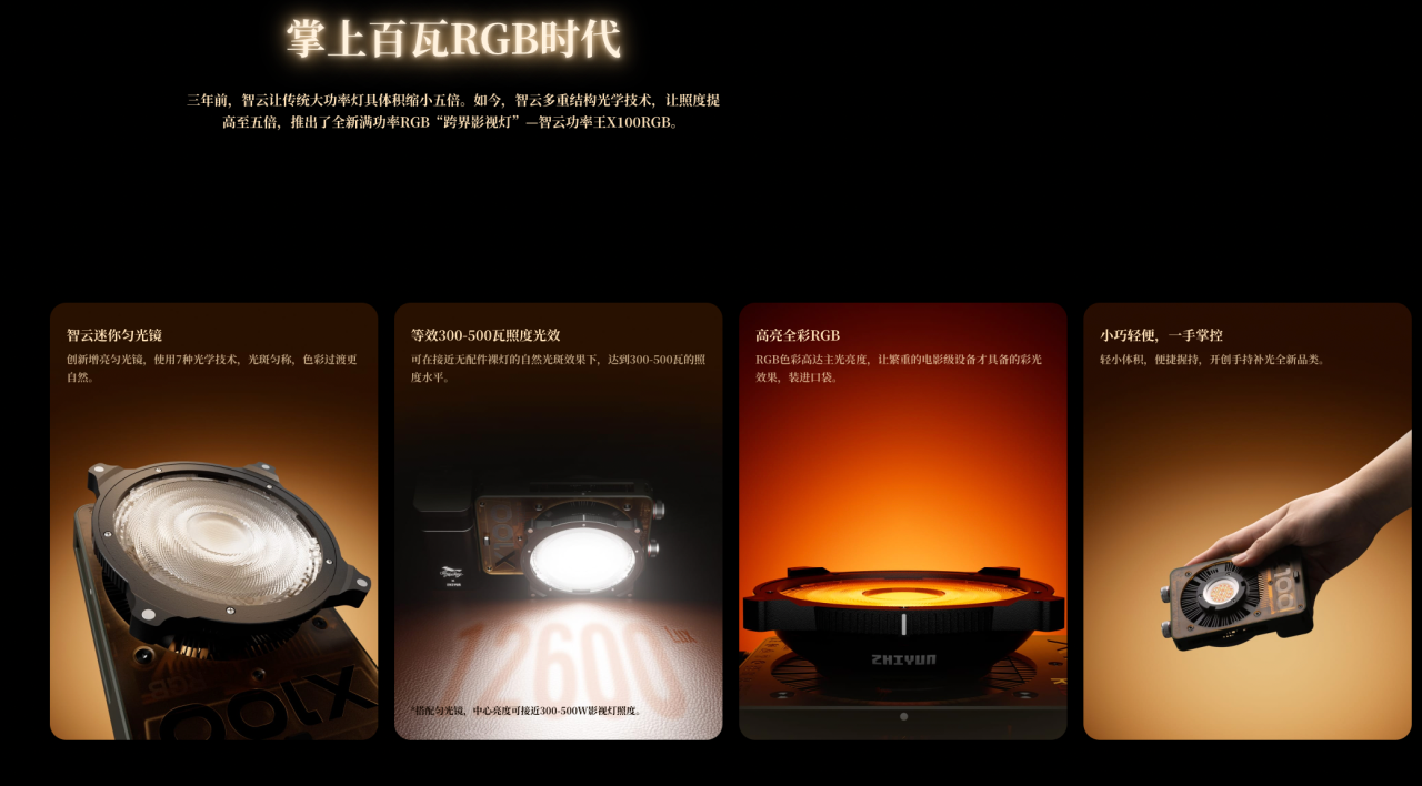 产品创新是智云保持竞争优势的核心驱动力。除传统稳定器产品外,公司重点布局影视灯光领域,推出的功率王X100影视灯开创了行业新标准。这款仅手掌大小的设备可提供100W专业光效,通过创新的散热结构设计,实现了”轻量化机身+专业级性能”的完美结合。