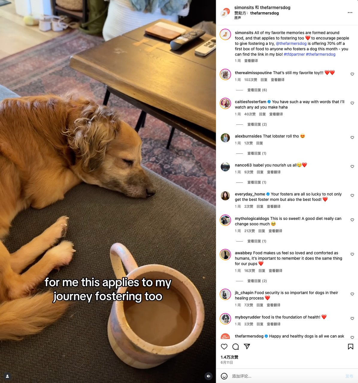 合作视频是Vlog形式的,Isabel从自己喜爱美食的原因谈起,讲到食物对人体健康的重要性,然后又延展到宠物的身上,以此来证明The Farmer’s Dog主打的“Human‑grade”是非常正确的配方。很有逻辑也很有引导性,足以让粉丝和路人信服。