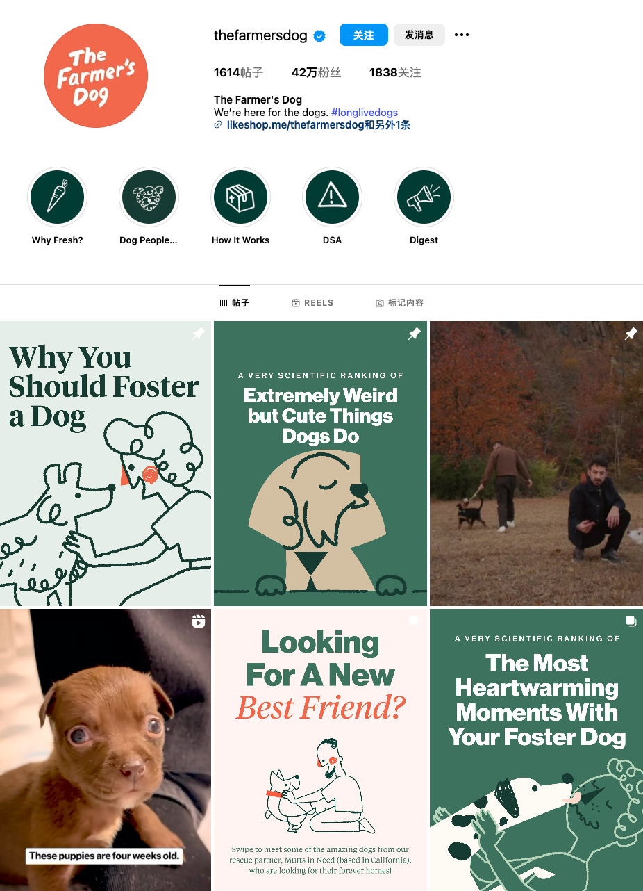 The Farmer’s Dog在 Instagram、Facebook 与 TikTok 上发布的短视频与图文内容,往往以“科学营养干货”和“高品质生活方式”为核心,而非简单的“可爱宠物秀”。