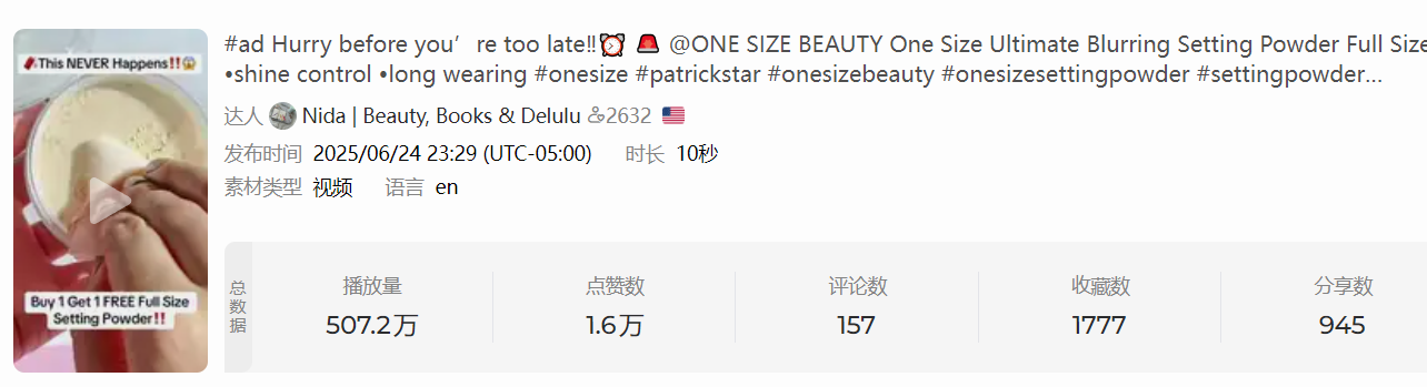 整个六月,它的销售曲线堪称“稳如老狗”,匀速出单。然而,6月25日,一个只有2632个粉丝的美妆博主@Nida | Beauty, Books & Delulu引发的流量核爆彻底改写了剧本——她一条评测对比视频播放量火箭蹿升至507万+,直接导致该散粉当日销售额飙升至惊人的89.2万美金,几乎占到了当月总销售额的八分之一!