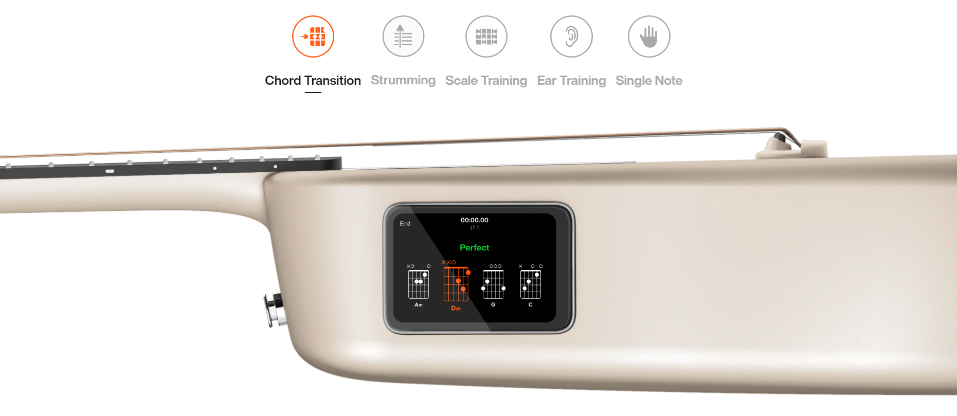 而至于自带曲谱、和弦转换、扫弦练习等功能也肯定是具备的,新手小白甚至还可以通过APP来实时查看自己的练习结果,方便掌握学习进度并及时调整反馈。