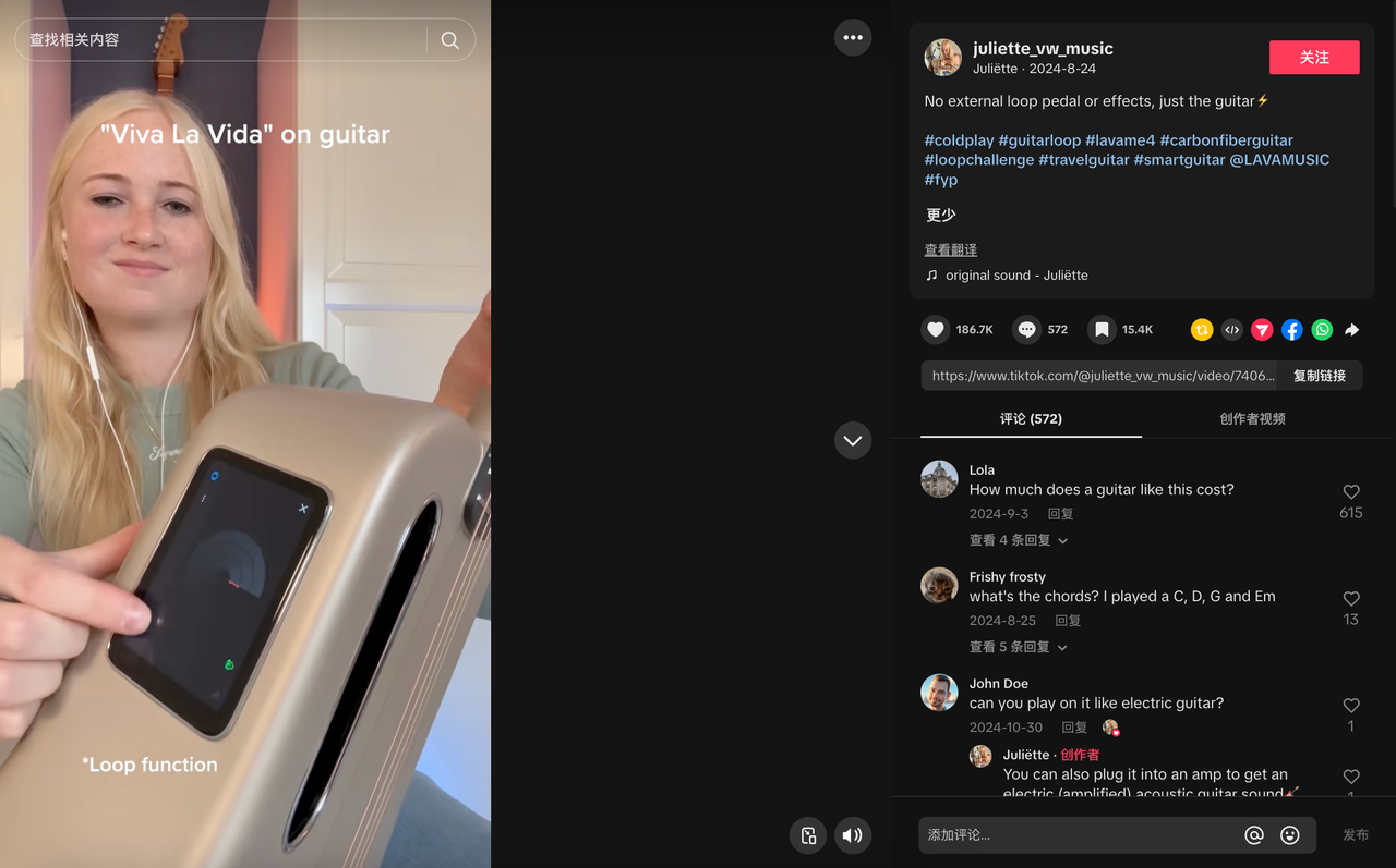 配合视频中展示出的LAVA ME 4内置循环功能的便捷,品牌吸引了大量对对“Loop”功能感兴趣的吉他用户。有第三方机构统计,在该视频发布后的一周内,LAVA MUSIC的TikTok官号粉丝涨幅达到3%,同期Loop标签的播放总量也提升了15%,品牌的曝光和热度得到了远超预期的提升。
