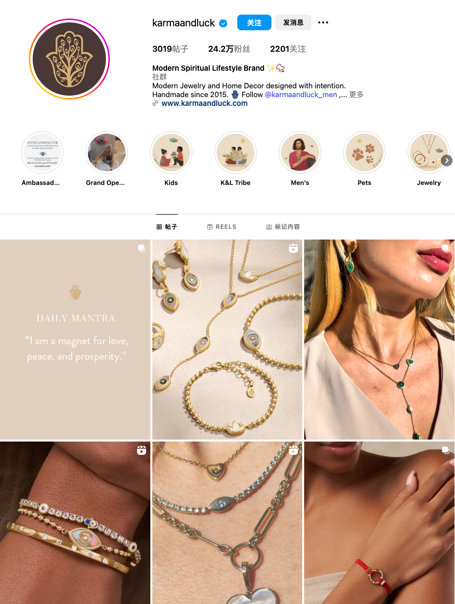 通过“现代灵性”的设计强化品牌识别,再辅以手工与真宝石凸显品质,最后配合分级定价满足不同预算,Karmaandluck建立了一套在灵性与时尚之间的稳固产品策略。