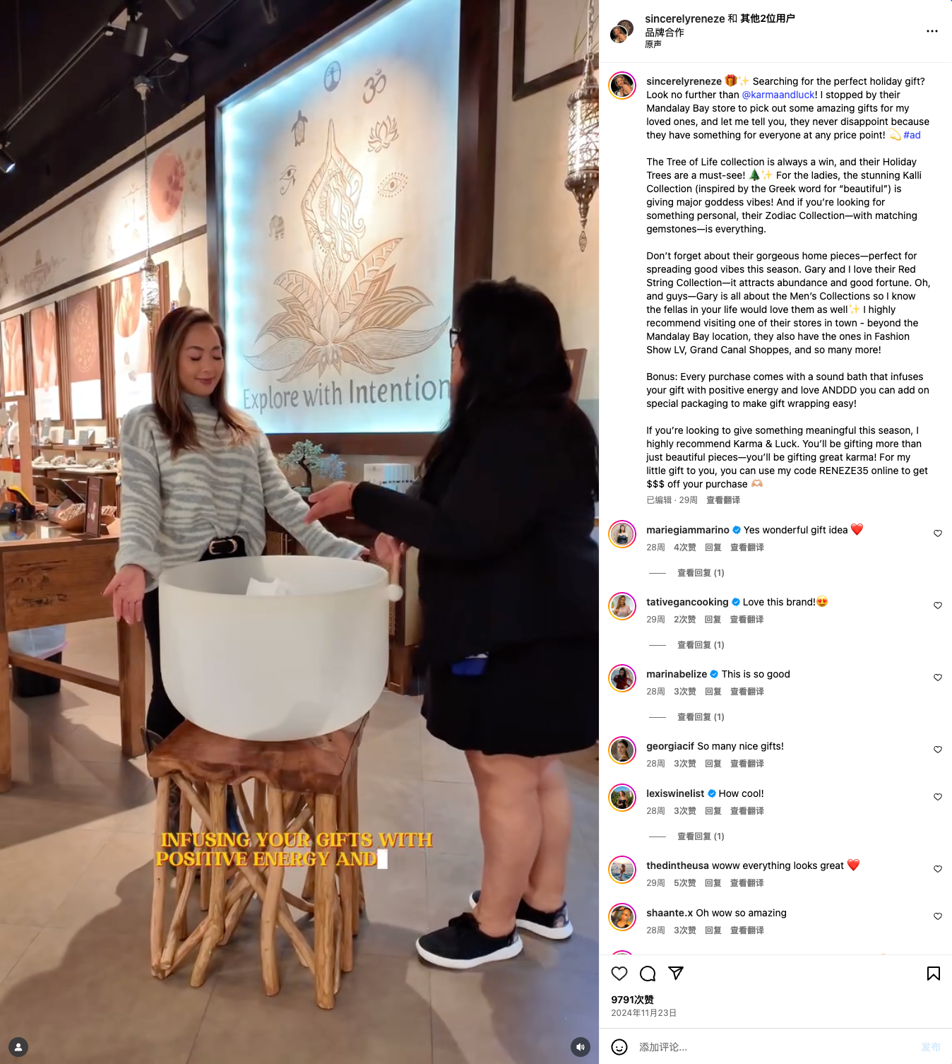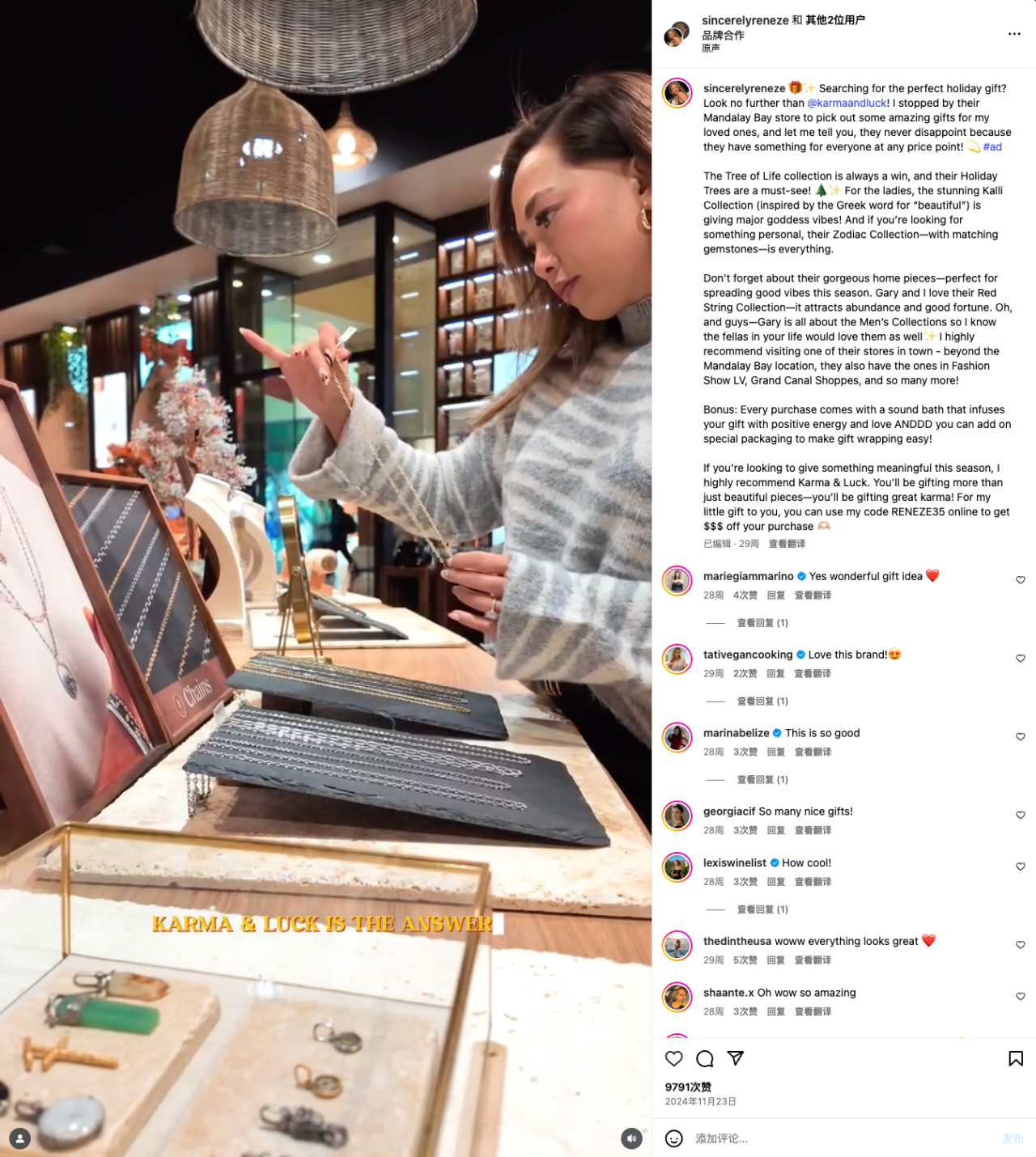 最终,这条合作帖文收获了22万的播放、9791次点赞和113条评论,数据反馈还是非常不错的。配合共同发帖功能和Reneze在简介处留下的优惠信息和品牌介绍。本次合作能够为Karmaandluck带来超出预期的回报。